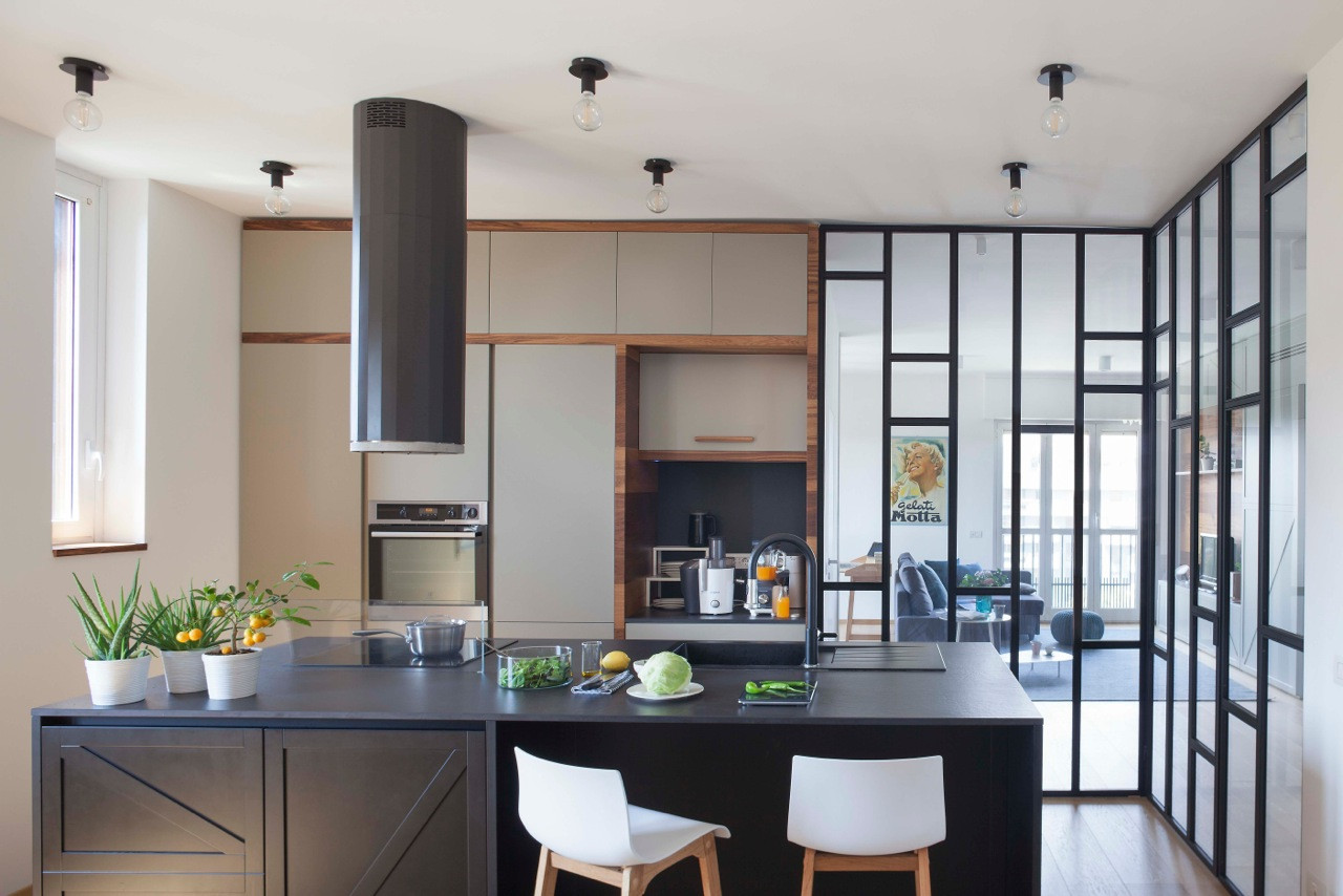 L’isola e la cappa fanno eco alla vetrata in ferro, riprendendone il colore. A questa danza armoniosa si uniscono poi anche tutte le lampade.