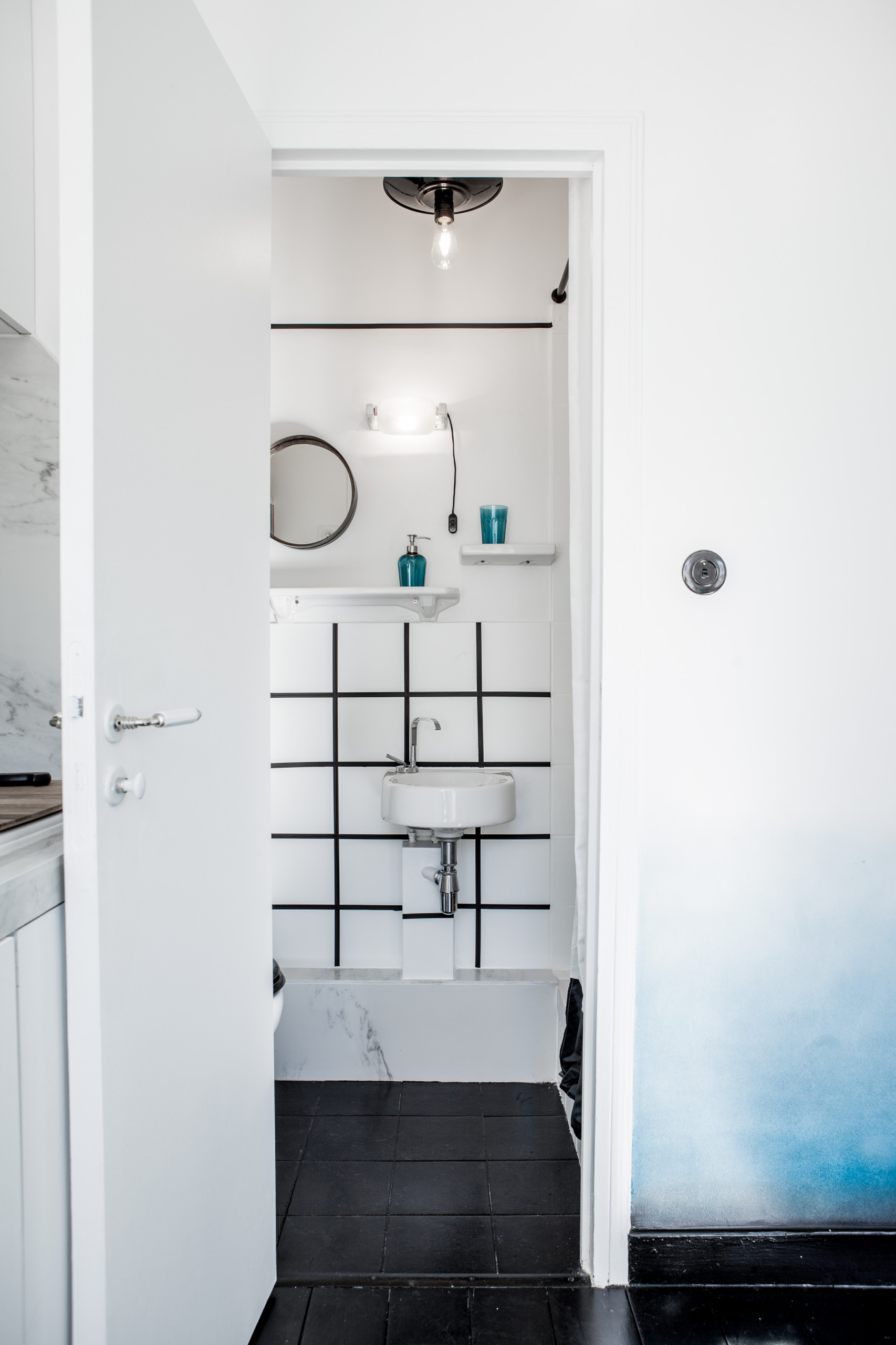 Alcuni accessori anni Trenta acquistati d’occasione ai mercatini dell’antiquariato, come le mensole in ceramica, ingentiliscono l’ambiente, caratterizzato dal contrasto bicromatico di bianco e nero. «Non amo particolarmente il tocco Art déco degli arredi anni Trenta, ma adoro lo stile grafico degli elementi architettonici dell’epoca, come parapetti, sistemi di illuminazione e così via», confida l’architetto. La sua grande cura per i dettagli l’ha spinta fino a comprare una vecchia maniglia di ceramica da abbinare agli interruttori Gras in porcellana vintage.