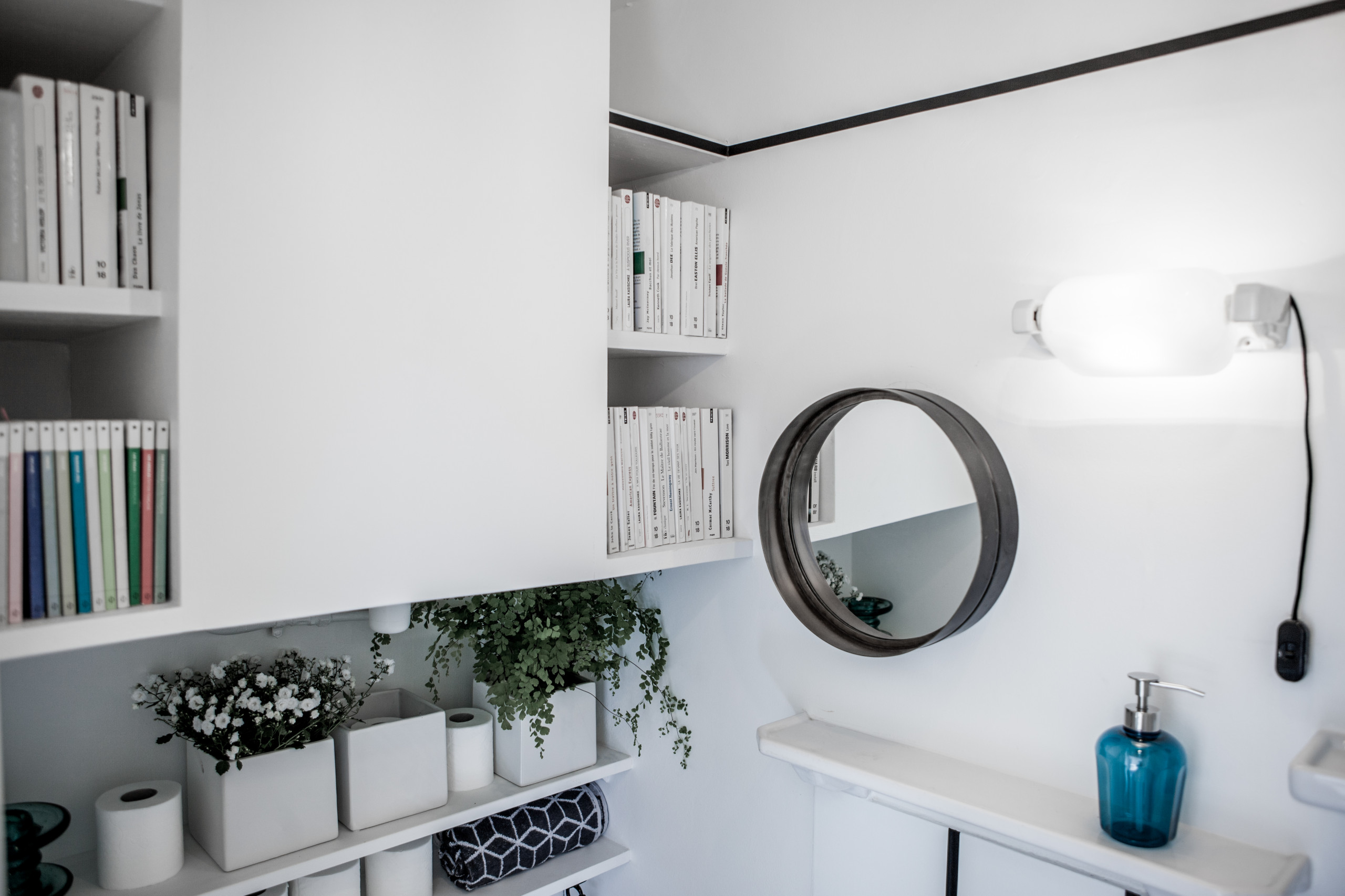 Un profilo nero corre lungo la parete sotto il soffitto riprendendo i canoni estetici della zona giorno e della plafoniera filiforme. A sinistra, sopra i servizi igienici, un apposito vano trasformato in libreria nasconde abilmente lo scaldabagno.