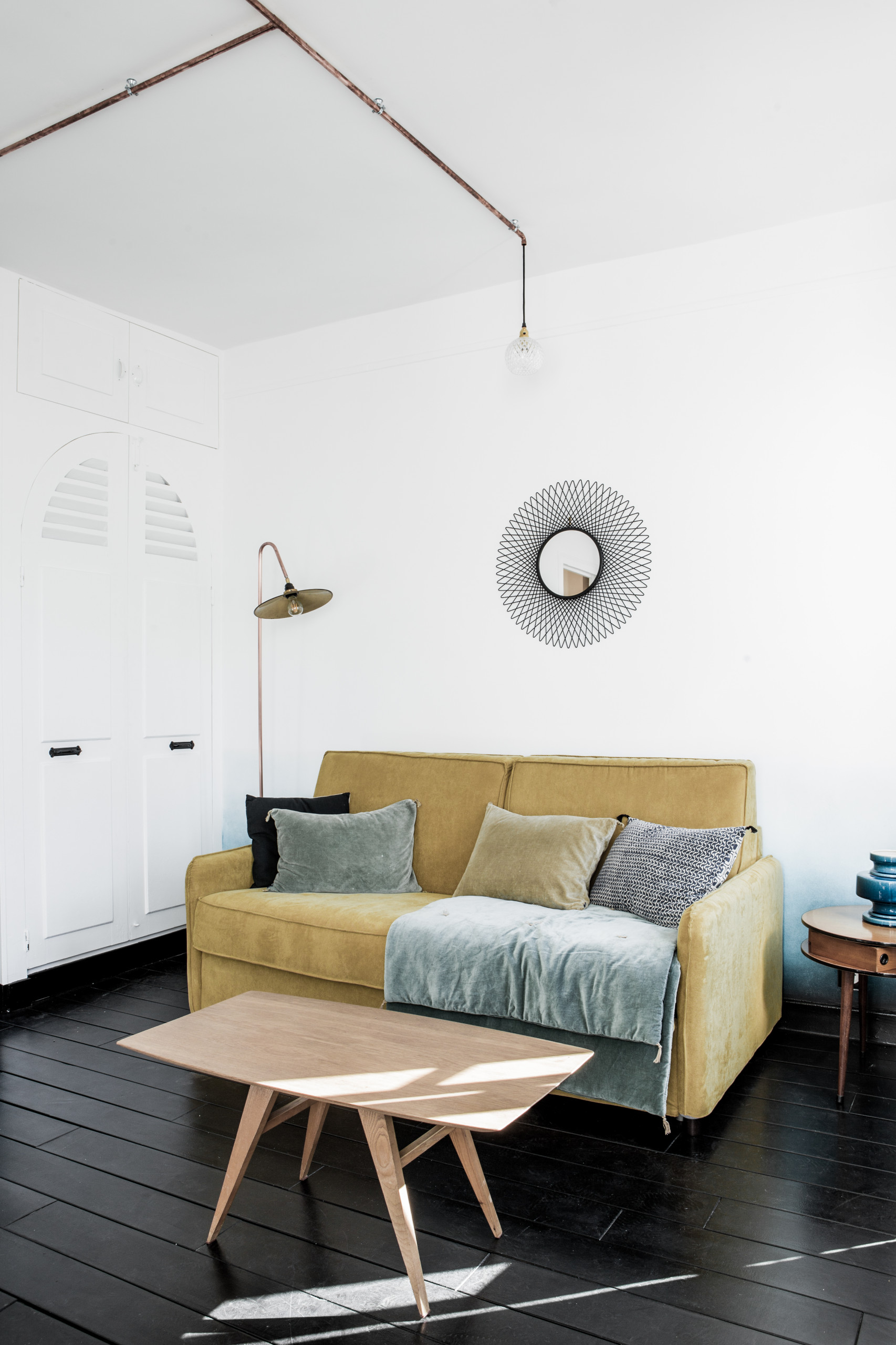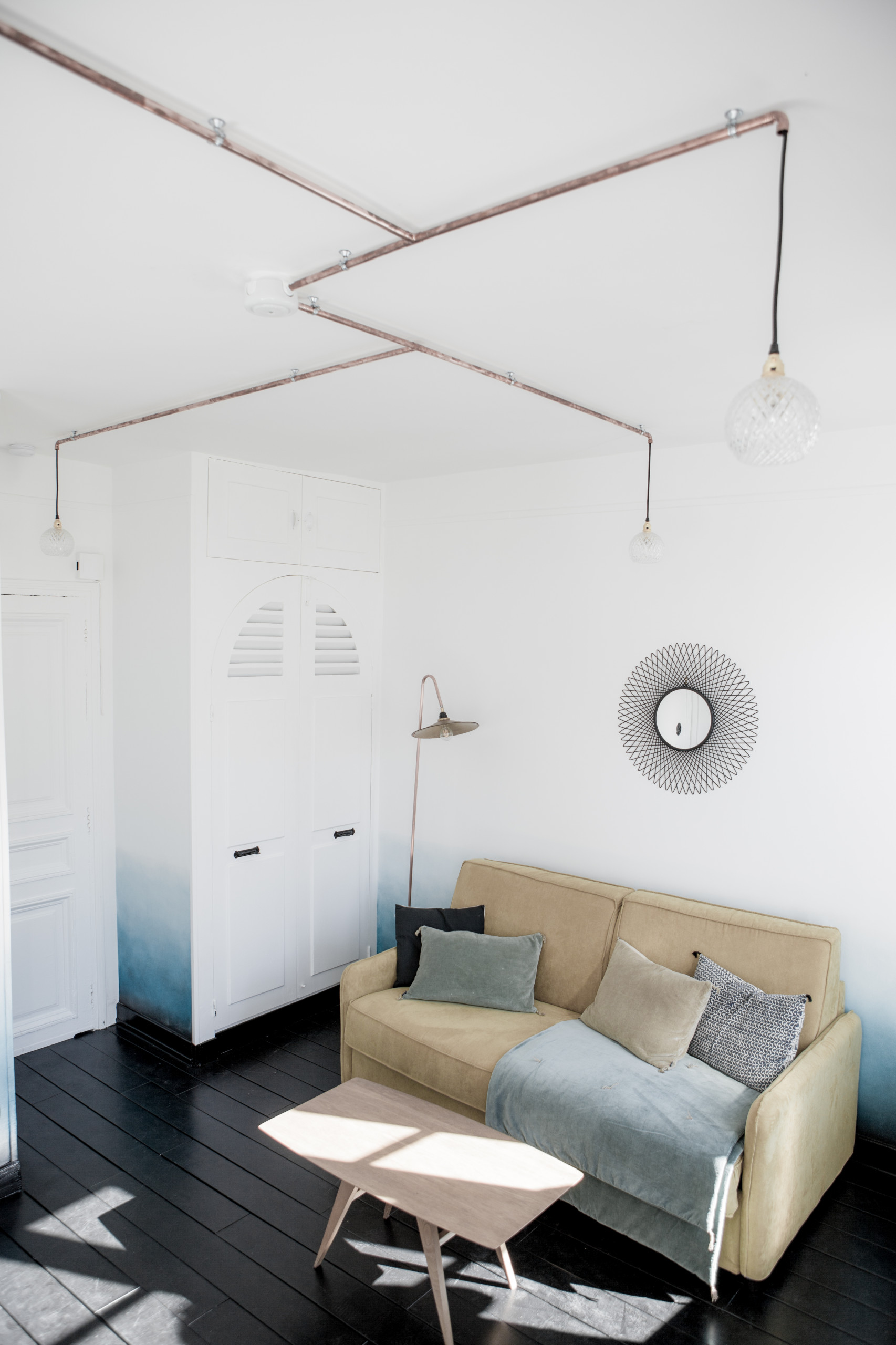 Nella zona giorno l’elemento sorpresa si colloca al vertice della bolla. L’architetto d’interni riteneva che il soffitto di 2,50 metri non fosse abbastanza alto da rendere giustizia a una lampada a sospensione di forma classica. Perciò ha ideato questo curioso sistema di illuminazione che si ramifica raggiungendo i quattro angoli del monolocale. Per realizzarlo la progettista è ricorsa a tubi idraulici in rame saldati insieme e sfere di cristallo cesellate, acquistate al mercato delle pulci.