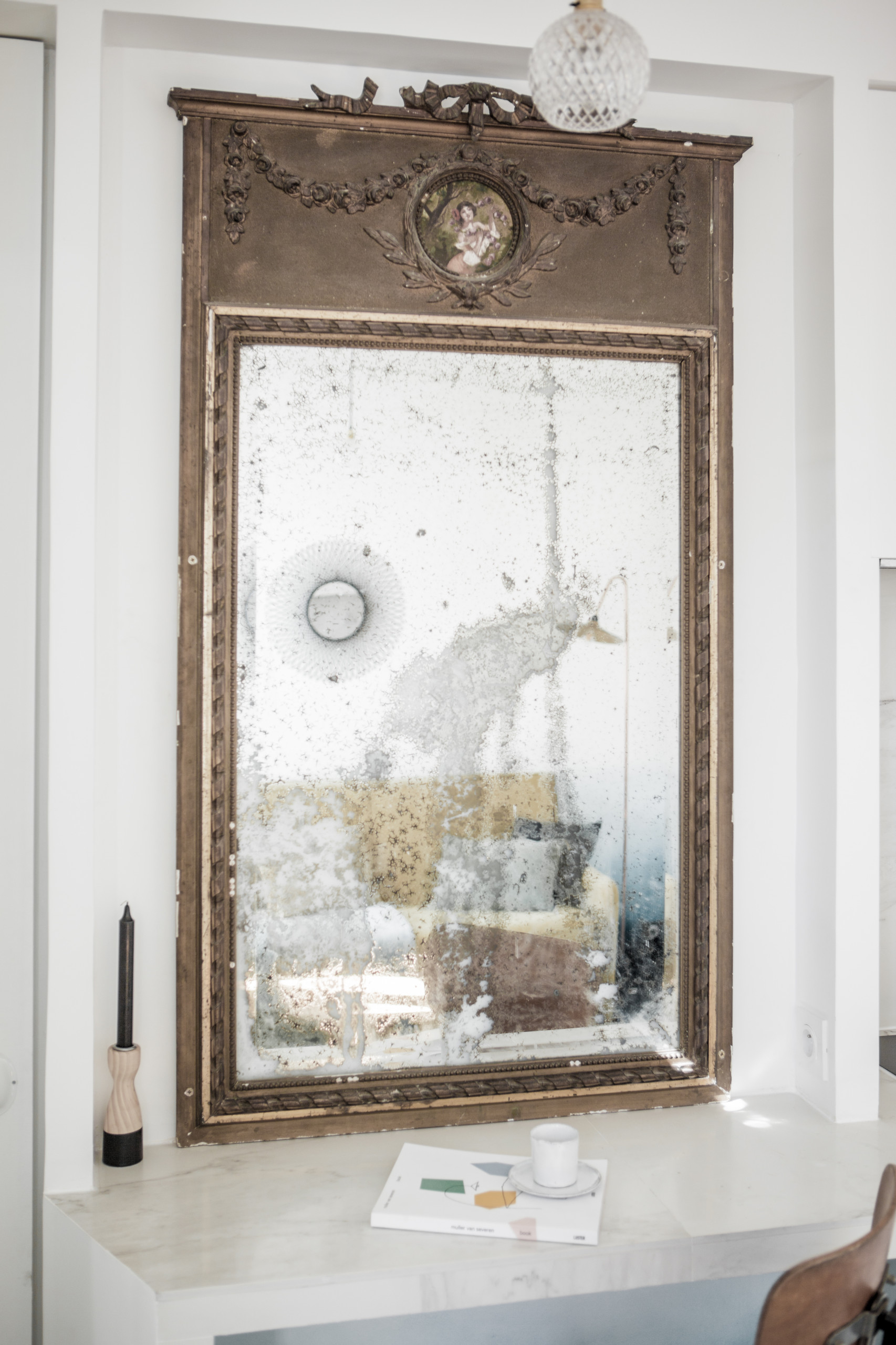 Questa struttura, simile alle consolle che si trovano nelle camere degli alberghi di lusso, contribuisce a conferire un tocco prezioso alla stanza. Il fascino che emana è dovuto a uno specchio dell’Ottocento con cornice decorata da un medaglione dipinto, acquistato per 50 euro da uno specialista nel recupero di oggetti antichi. «Questi dettagli ricercati, così come gli affreschi, rivalutano considerevolmente l’immobile, incrementandone il valore di mercato», spiega l’architetto.