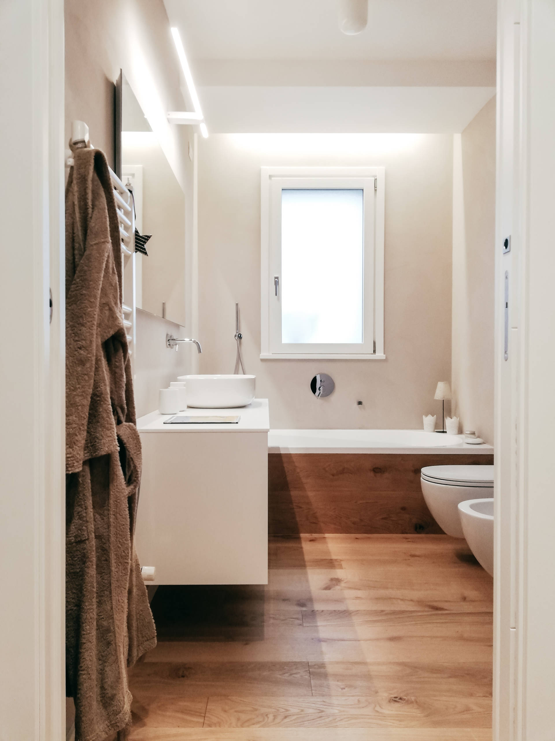 Tra wc e bidet è bene lasciare lateralmente minimo 15-20 cm, misurati nel punto più largo; davanti è invece necessario lasciare almeno 60-80 cm per il passaggio.
