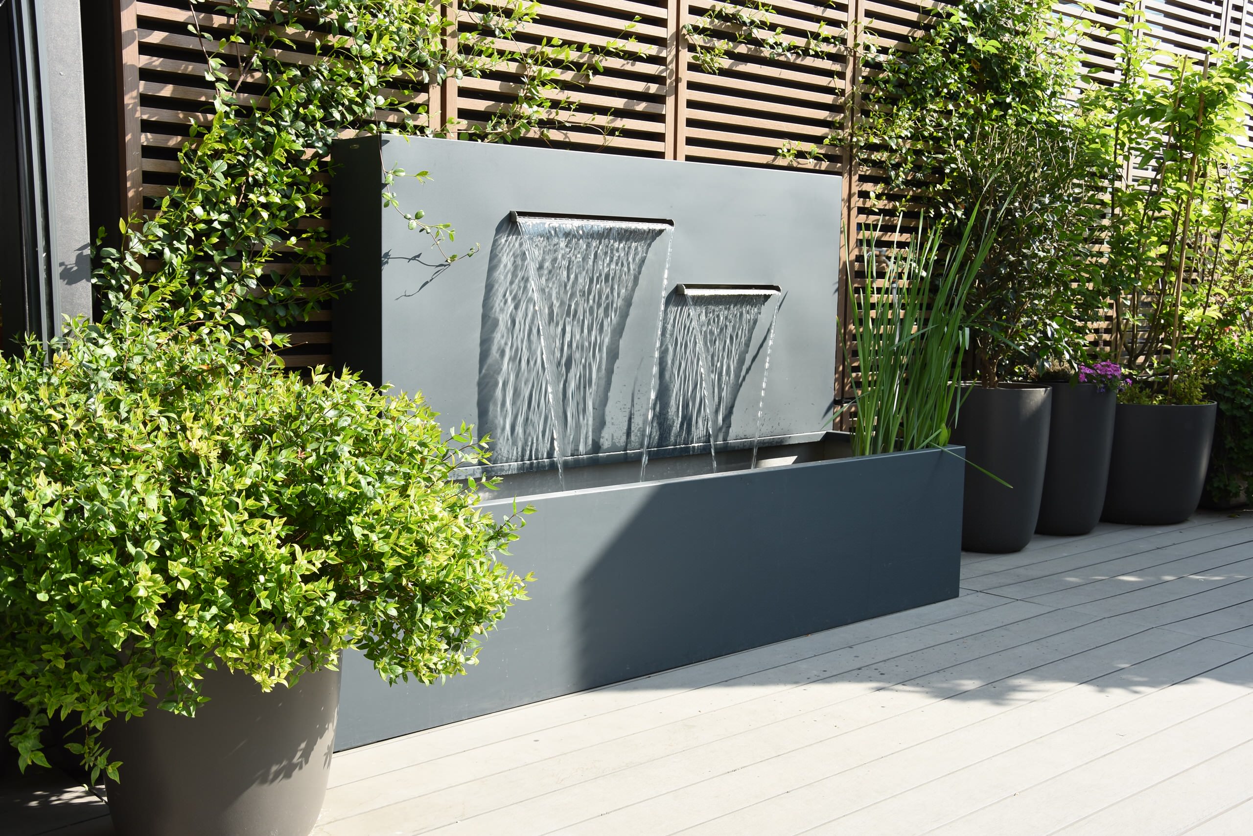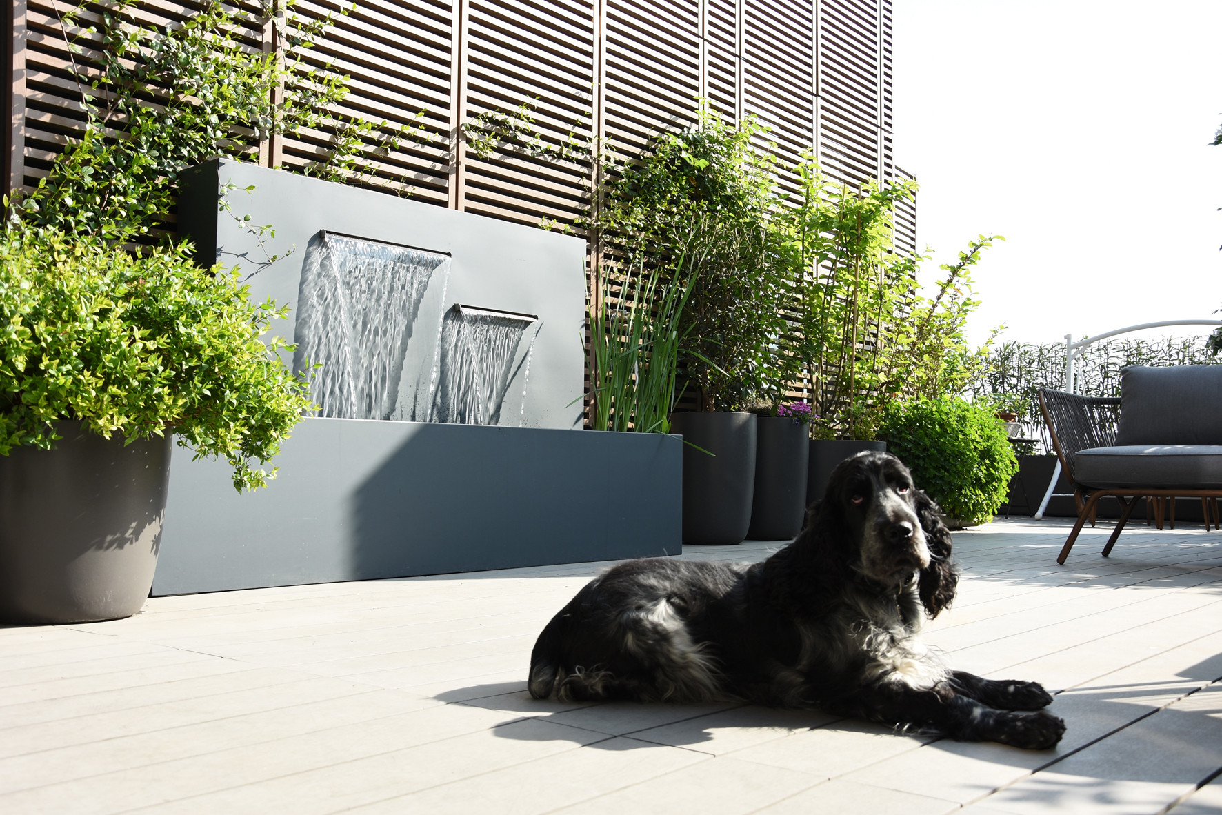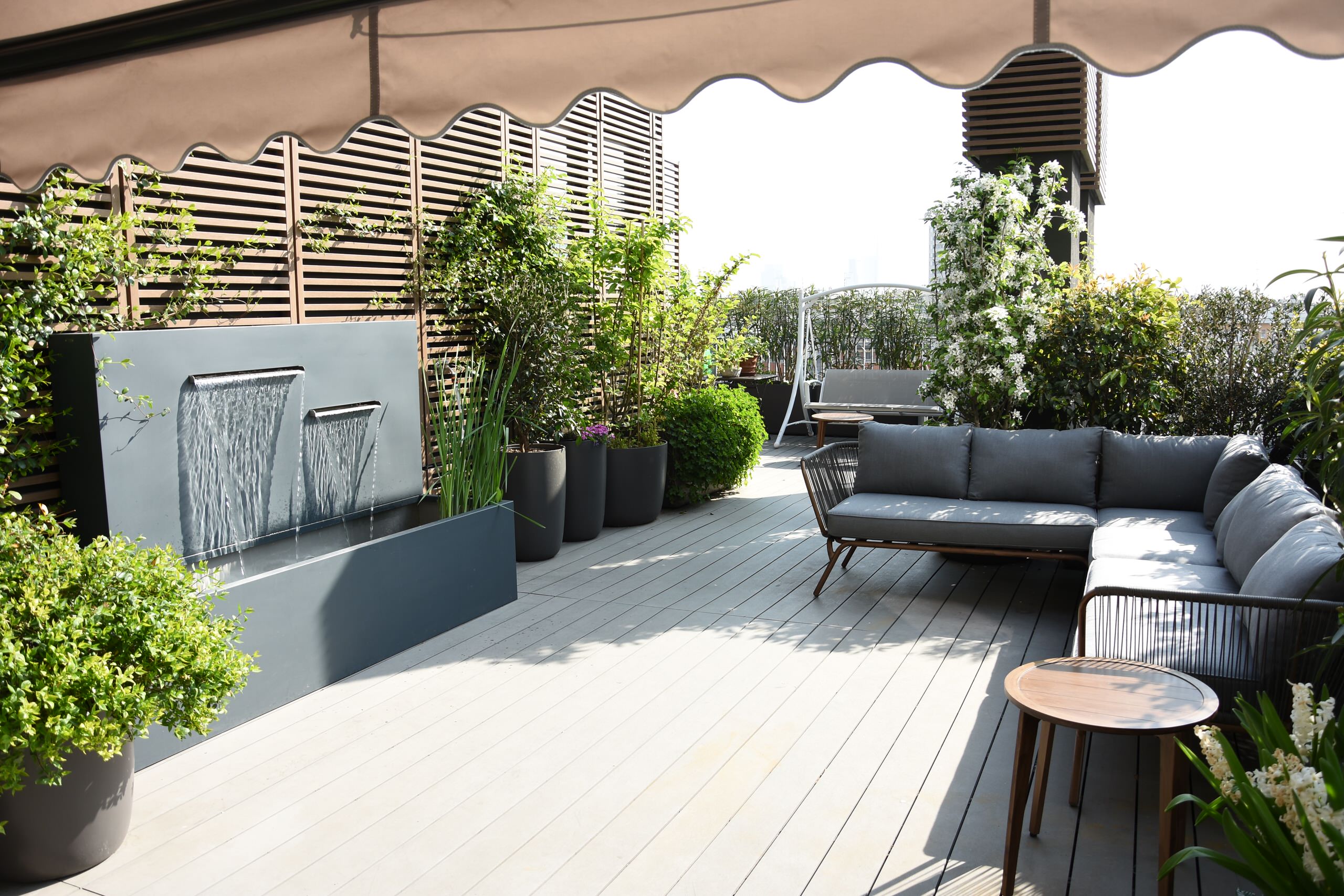 «La richiesta di avere una fontana» ci dice l’architetto Invernizzi, «È stata seguita dall’elaborazione del progetto che ha portato a una vasca divisa in due settori in cui far crescere piante acquatiche. L’acqua arriva nella vasca attraverso due lame a quote sfalsate». Il trasporto e posizionamento in loco ha rappresentato l’unica vera difficoltà nella sistemazione di tutto il terrazzo. Ma grazie alla presenza di una gru ancora presente nel cantiere dell’edificio si è potuta sollevarla fino all’ottavo piano. Qui è poi stata posizionata nel punto in cui il solaio prevedeva già il peso di una mini piscina.