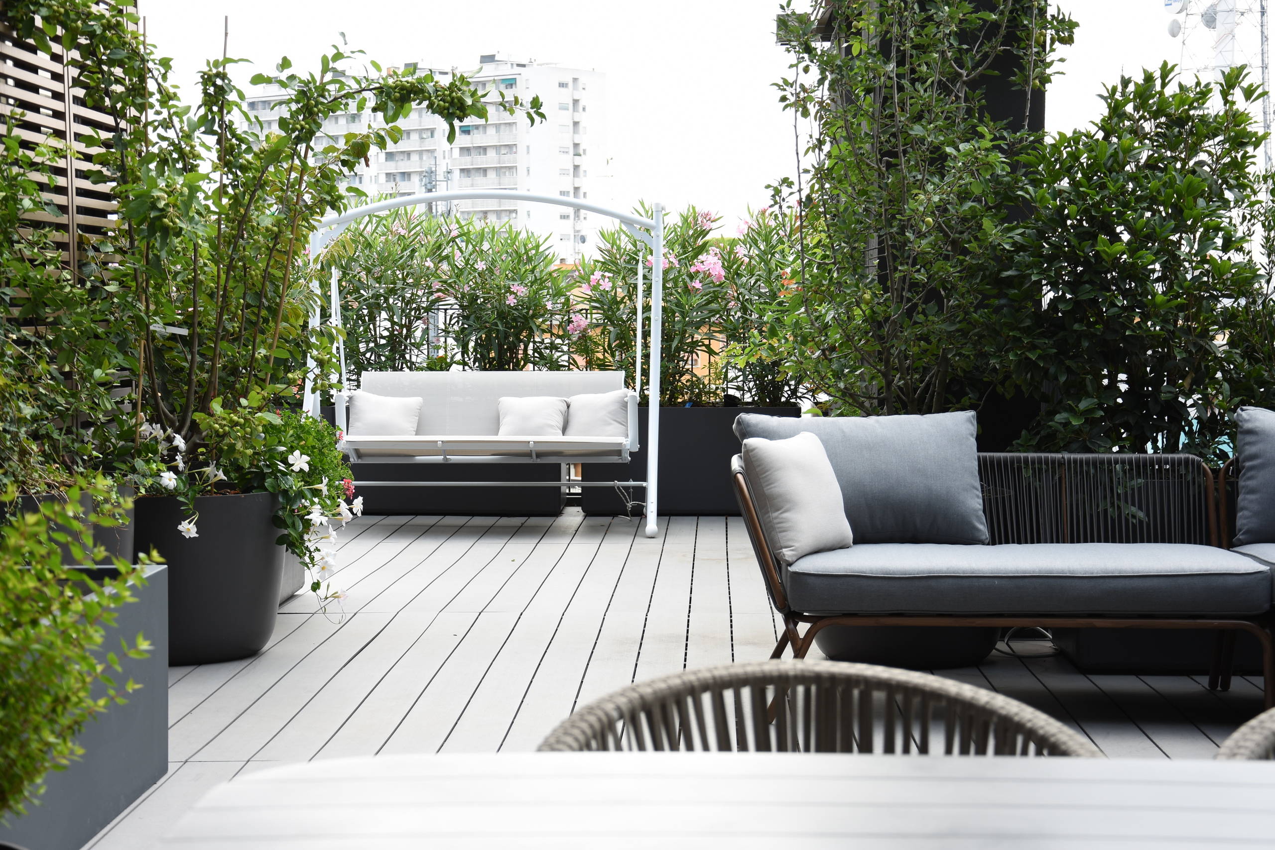 All’ottavo piano di un elegante edificio che guarda i grattacieli della città, fiorisce un giardino rigoglioso, uno scampolo di natura che lascia fuori la frenesia e racchiude uno spazio intimo in cui rilassarsi al bisbiglio dell’acqua.