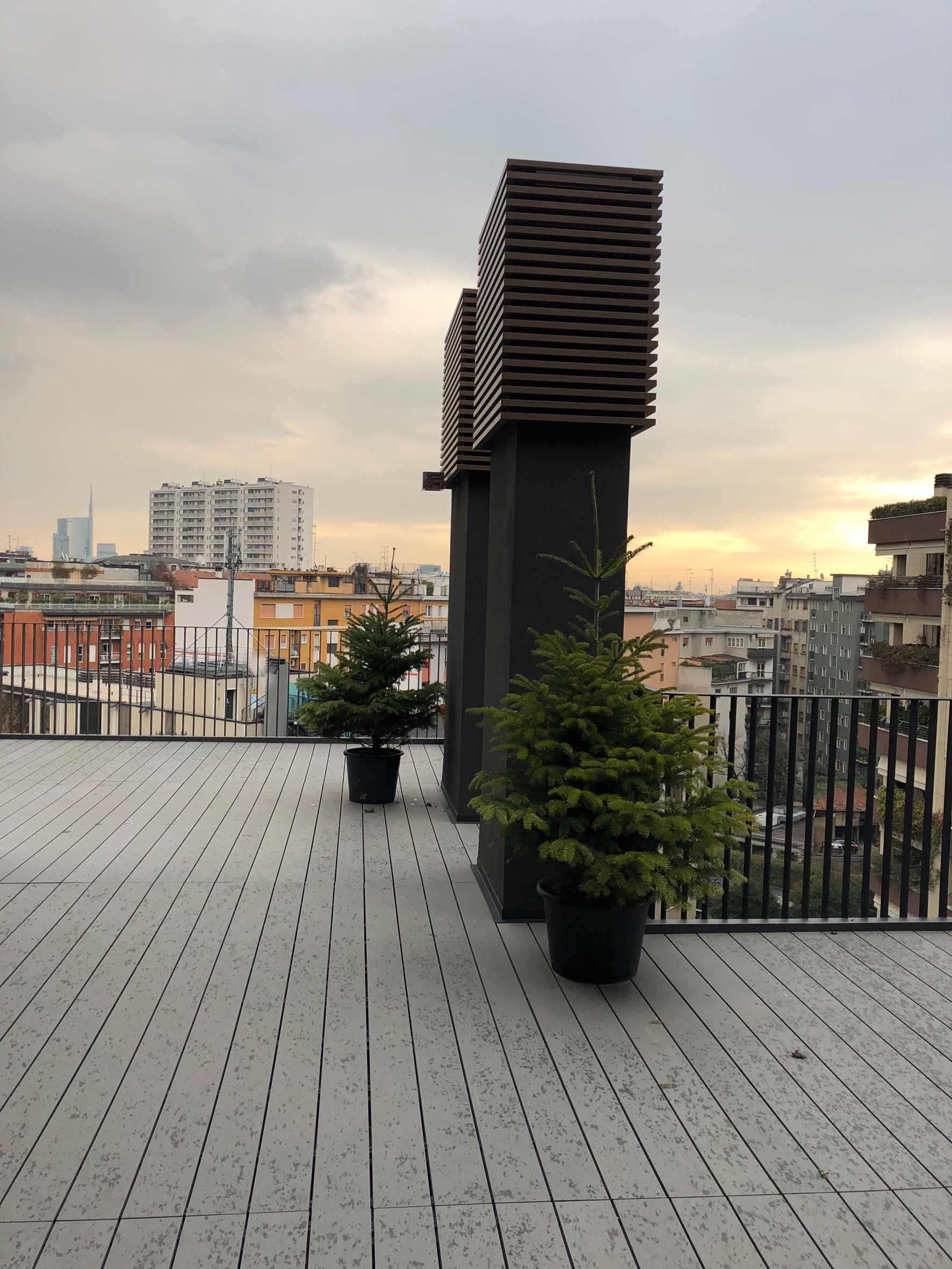Fioriere e vasi in fibrocemento di colore grigio antracite completano il terrazzo con grande varietà di piante, rampicanti e ben otto alberi a dare vita ad una piccola ma lussureggiante oasi in quota. Quasi tutte le specie sono state scelte dalla proprietaria e poi disposte con perizia dalle progettiste. Se vi siete già innamorati di qualcuna di queste, a seguire trovate l’elenco di tutte le piante: