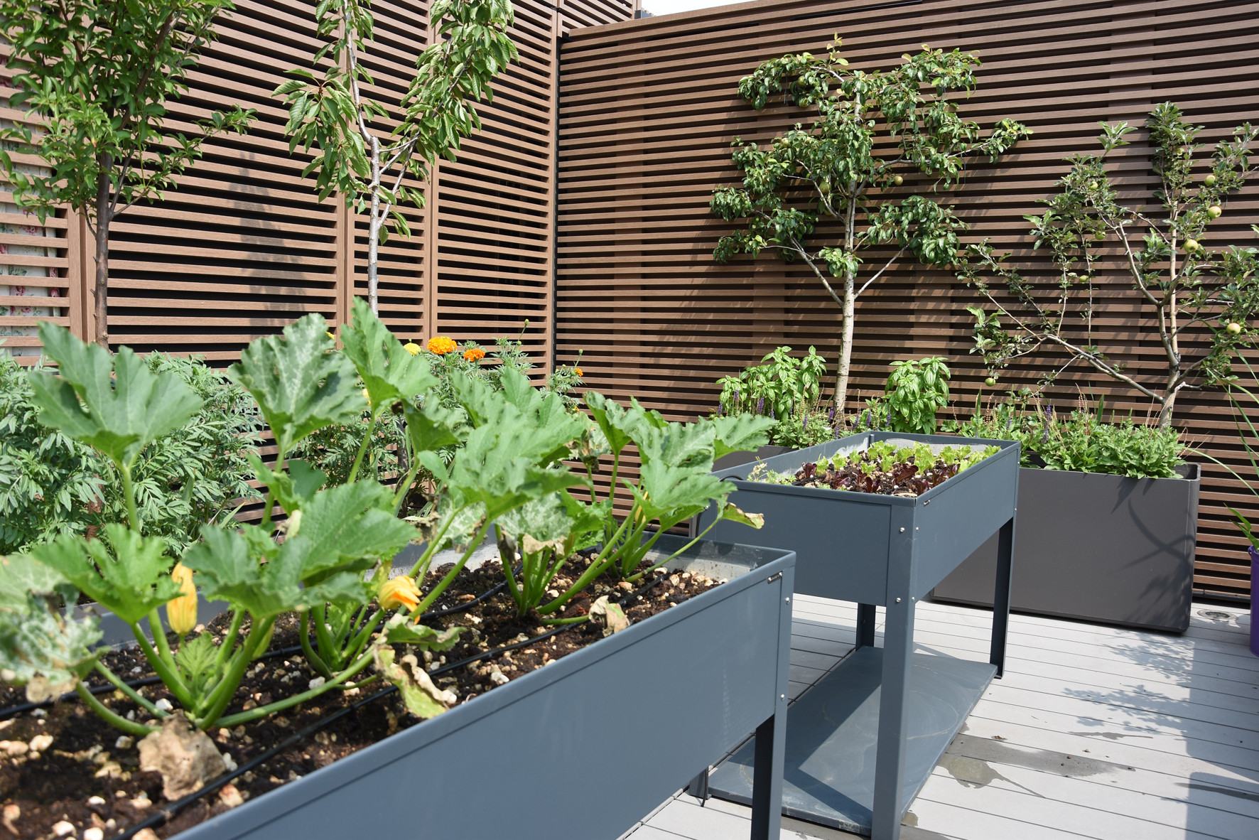 Altra richiesta imprescindibile contemplava la realizzazione di un piccolo orto per coltivare ortaggi e verdure con lo stesso amore per alberi e rampicanti. Sono stati realizzati dei tavoli da orto in acciaio verniciato, così da avere uniformità col materiale e il colore degli arredi del terrazzo. Ha così preso vita un piccolo orto in vasca che provvede, stagione dopo stagione, a portare in tavola pietanze fresche e bio al 100%.